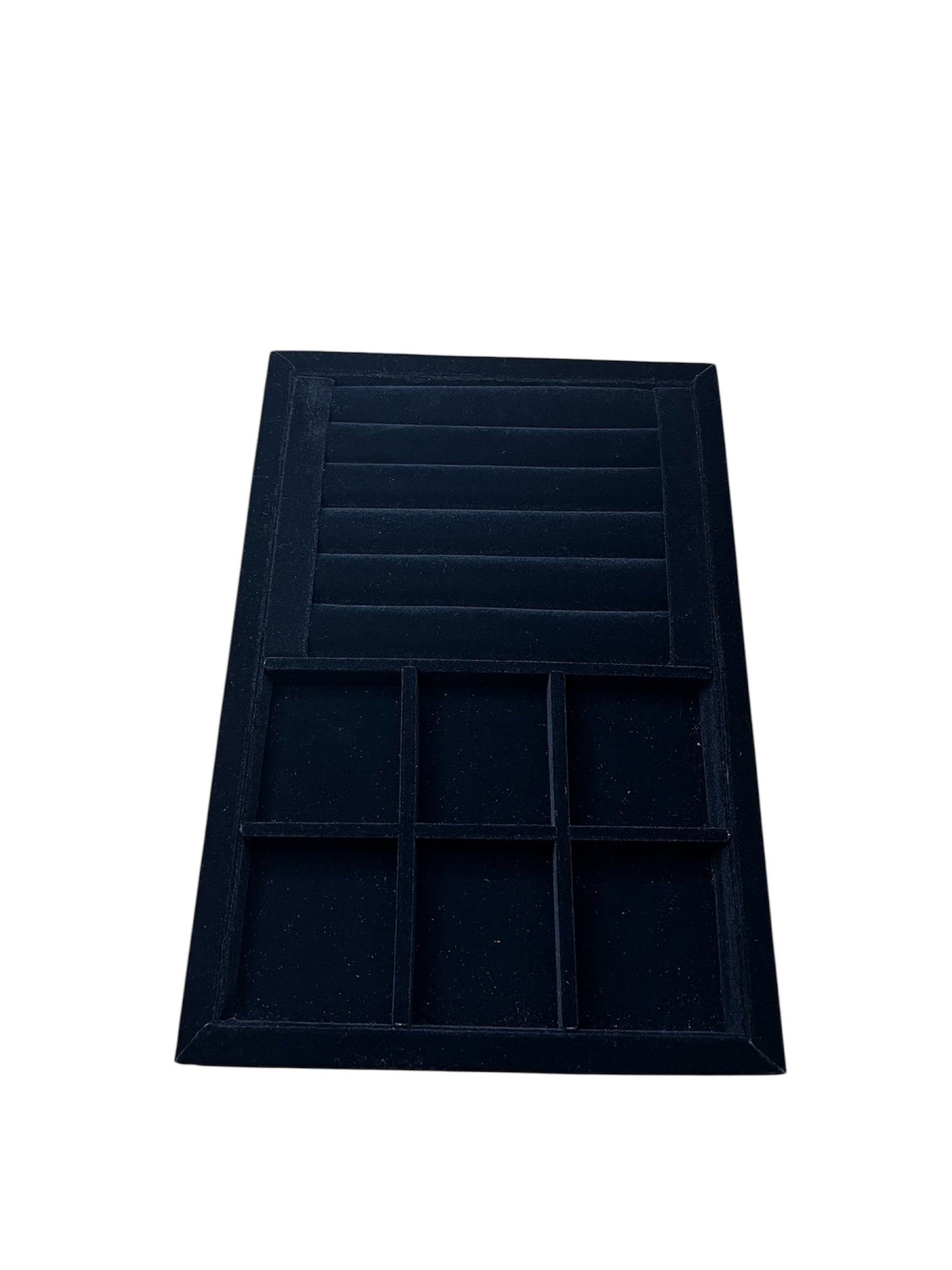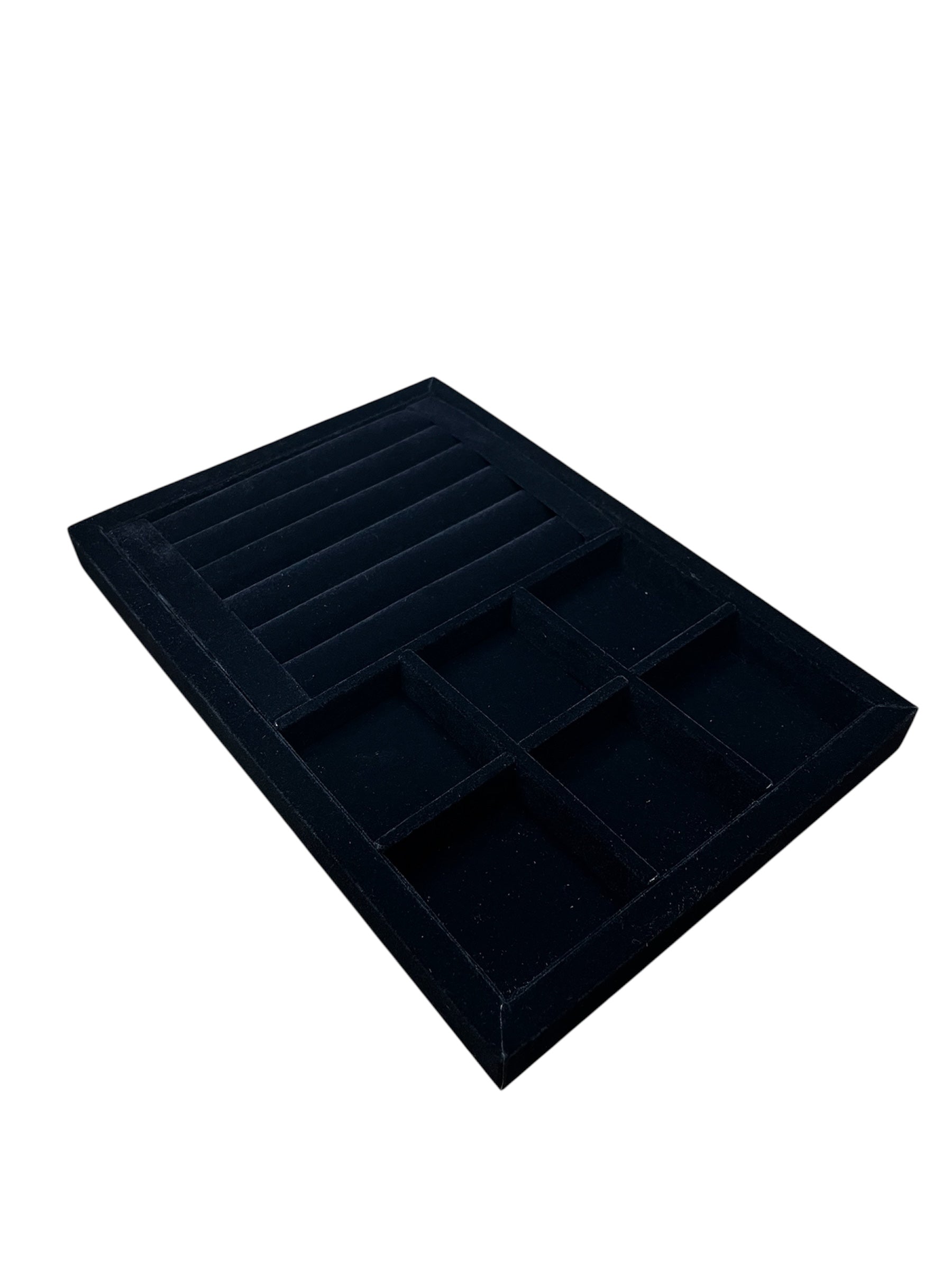 Essa bandeja porta-joias em veludo cinza é perfeita para armazenar anéis, brincos, pulseiras e colares de forma prática e elegante. Com divisórias internas bem distribuídas, ela garante que cada peça fique segura e no seu devido lugar.