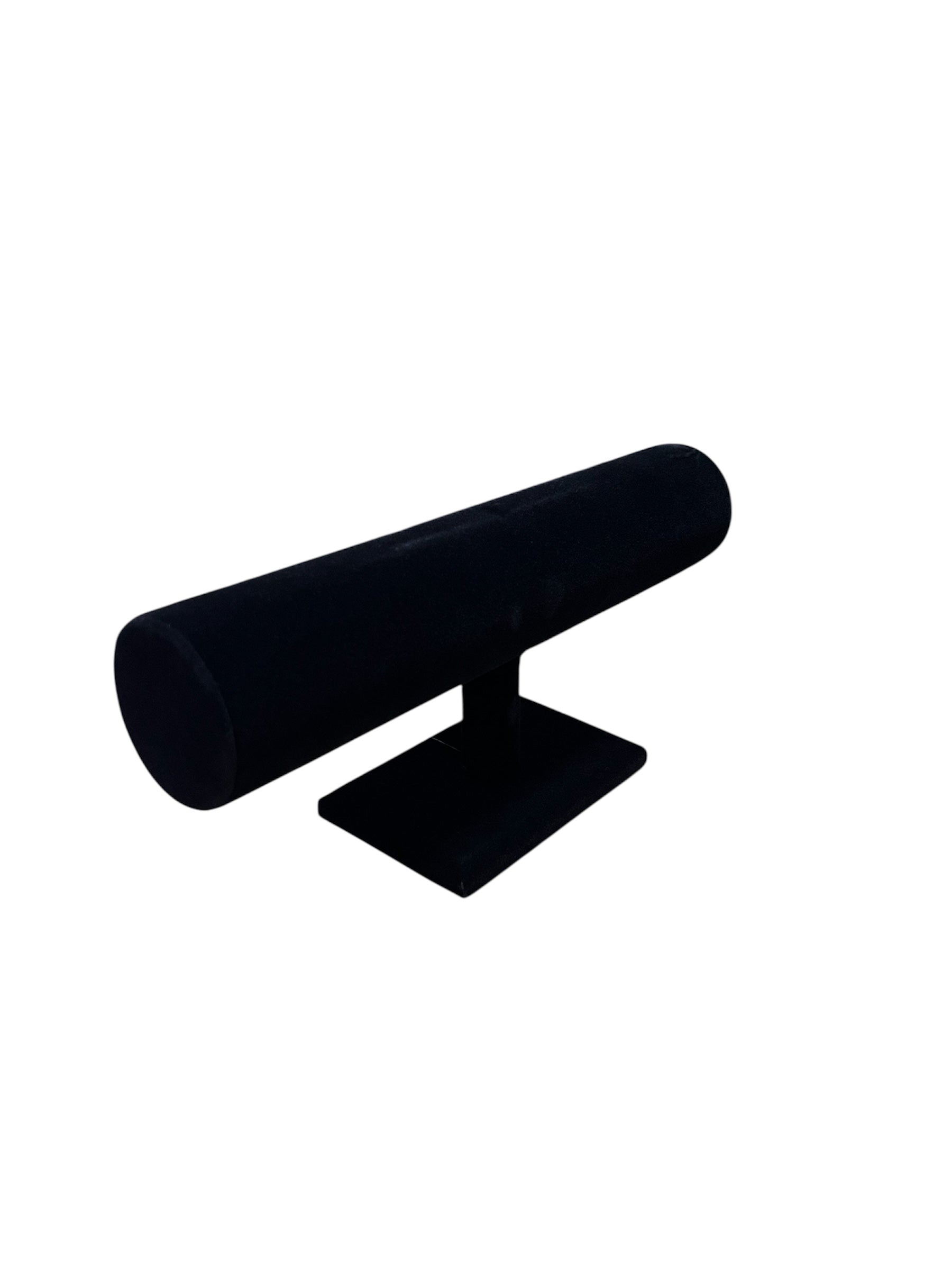Feito com acabamento em veludo preto, esse suporte cilíndrico é ideal para vitrines, feiras ou até para deixar sua coleção mais bonita em casa.